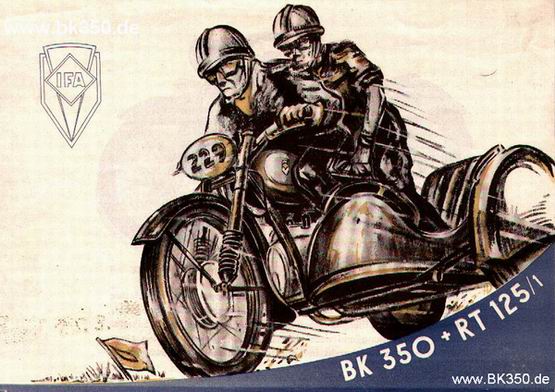 Bei der Zeichnung "werb_bk_sw_ge" handelt es sich um ein Werbefaltblatt (sowas hat es tatsächlich gegeben) der Firma Mugler aus Oberlungwitz, welche auch heute noch Werbeprospekte erstellt. Das Faltblatt stellte BK 350 und RT 125 gegenüber. Hier zu sehen ist das Deckblatt, rückseitig ist eine Tabelle mit den technischen Daten der beiden Maschinen plaziert. Im Innenteil heisst es zur BK: "Ein Motorrad mit hervorragenden Eigenschaften, robustem, vollgekapselten Zweitakt-Boxermotor, Kardanantrieb. In vielen Zuverlässigkeitsfahrten erprobt. Rasante Beschleunigung und überdurchschnittliche Bremswirkung durch große Vollnabenbremsen - Ein seitenwagenfestes, leistungsfähiges Motorrad für den anspruchsvollen und sportlichen Fahrer." Da war wohl die reißerische Aufmachung des Deckblattes mit Kradmelderhelmen und verwegenen Gesichtern ein Muß. Fragen wirft der links montierte Beiwagen auf. Die Startnummer 229 ist übrigens genau die von der ADAC-Deutschlandfahrt 1953!