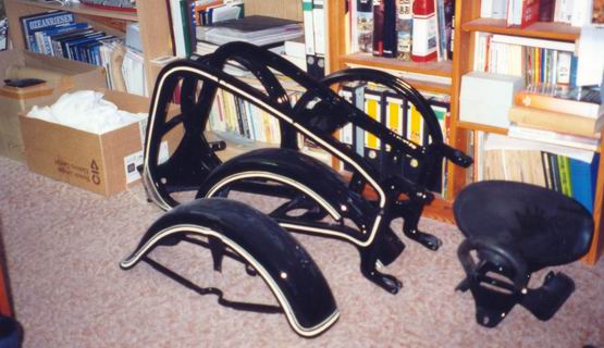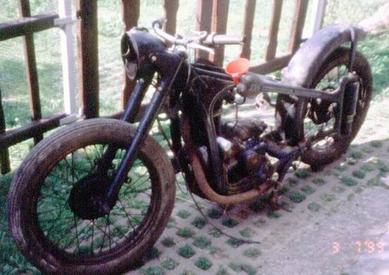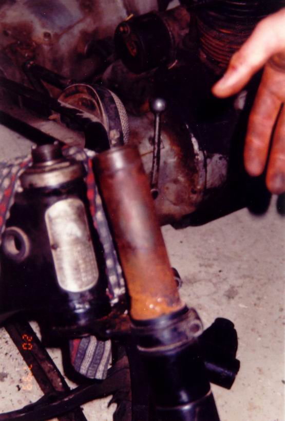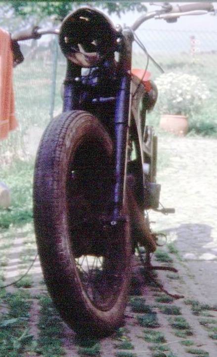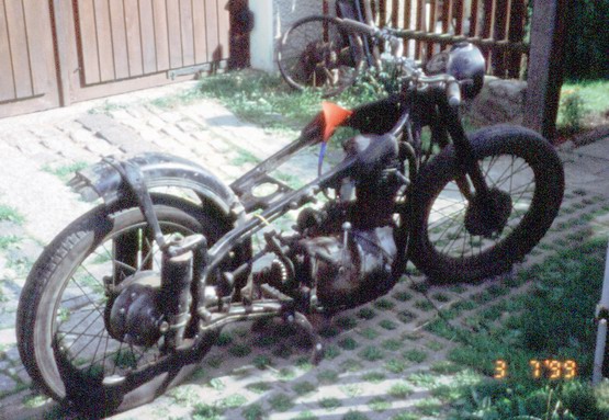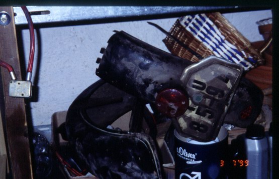 Nie wieder ... wirklich nie wieder ;) Das ist mein erster Gedanke, wenn ich an die EMW denke. Aber vielleicht von vorne. Bis jetzt (09/2003) habe ich die EMW hier im Netz etwas stiefmütterlich behandelt. Das liegt einerseits daran, dass nicht sehr viele Fotos von der Restaurierung existieren und sich diese noch dazu über lange Zeit hinzog und bis jetzt noch nicht richtig abgeschlossen ist. Im Mai 1999 kam die EMW zu uns - man kann sich ja anhand der Bilder den erbärmlichen Zustand vor Augen führen. Einen ersten Vorgeschmack auf den wirklichen Zustand bietet das Bild von der Demontage der Telegabel, welche total "aufgeblüht" war. Rost wäre noch das geringste Übel gewesen. Das eigentliche Problem war, dass dieses Konklomerat von Teilen - auf den ersten Blick durchaus vollständig - nie ein ganzes Motorrad gewesen war. Es passte einfach nichts. Das Hinterrad stammte aus irgendeiner alten BMW, der Rahmen war an mehreren Stellen gerissen (die typischen Stellen an den Seitenwagenbefestigungen), der Vergaser zerbröselte mir beim Abziehen des Luftfilters, der Hinterradantrieb ähnelte einer Sandkiste und hatte einen Riss im Lagerauge des Antriebsritzels... Auch wenn sich die Probleme alle nacheinander beheben ließen... wäre es meine erste Restaurierung gewesen - ich hätte wohl schnell den Spaß an diesem Hobby verloren. Ein Glück, dass bei der BK-Restauration alles bis auf die letzte Unterlegscheibe vollständig war und passte.