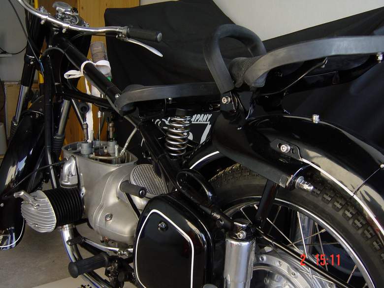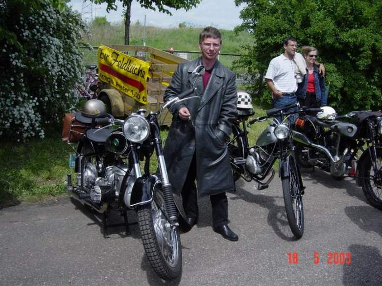 Lackierung: hier hat wohl jeder seine eigenen Vorstellungen/Ansprüche. Bei den Zylindern/Köpfen habe ich sehr gute Erfahrungen mit dem Hochtemperaturlack bis 700° (Einbrennlack) von "Duplicolor" gemacht. Blechteile wurden in einer Lackiererei gemacht (incl. pulverbeschichtetem Rahmen und Handlinierung!!). Kleinarbeiten: deren gab es sehr viele. Ob es das Anfertigen von Buchsen für Bremsschlüssel oder Hauptständer waren, das Anfertigen einer neuen Achse samt Hülse, die den Fahrersattel in seiner Schwinghalterung hält (mit Schmiernippelaufnahme), oder der verbeulte Lampentopf, oder die Instandsetzung der Sättel, oder das Einspeichen der Räder in neue Felgen, oder die Instandsetzung der hinteren Federung incl. Einspannen in den Rahmen, oder...... Zusammenbau Irgendwann Ende Mai 2002 habe ich meine Teile (Rahmen, tragende Teile und Blech) zum Aufarbeiten + Lackieren abgegeben. Eigentlich sollte alles bis ca. Ende Juli fertig werden. Irgendwie hatte es aber Verzögerungen gegeben. Kein Thema, denn da war Jahresurlaub bei mir und meiner Familie "angesagt". In der laufenden Saison würde ich mein "neues Kind" sowieso nicht mehr zur Fertigstellung bringen (incl. Vollabnahme) und damit war jeder Zeitdruck genommen. Im August dann die "Hiobs-Botschaft": das Elbe-Hochwasser der sog. "Jahrhundertflut" hat die Lackiererei teilweise mitgenommen. Ein Großteil der Einrichtung war mehr oder weniger Schrott und die Kompressoranlage hatte einen Totalschaden. Positive Nachricht dabei: meine Teile waren alle noch da! Anfang Oktober 2002 dann die erlösende Nachricht, dass meine Teile fertig sind und zur Abholung bereit liegen. Mittlerweile hatte ich mir eine eigene Garage zugelegt (als "Weihnachtsgeschenk" 2001), wo es sich bedeutend besser arbeiten lies. Und dann ein richtiger "Rückschlag": Motor und Getriebe zusammengebaut, alles wunderbar, alle Gänge "auffindbar", aber was war das??! Der Motor lies sich nicht durchtreten! Was war jetzt nun wieder los? Die Lösung war ganz einfach: durch das Stahlkiesstrahlen der Zylinder + Zylinderköpfe war die "Ringfuge" an den Köpfen, die für Abdichtung des Zylinders sorgen kaum noch vorhanden. Das neue Planen aller Dichtflächen (und auch der Fuge) hatte dafür gesorgt, dass zu viel Material abgetragen werden mußte, so dass bei fertig zusammengebautem Motor die Hublänge von Zylinder + Kopf nicht mehr ausreichte und die Kolben regelrecht am Kopf angeschlagen haben. Nicht viel, aber genügend, um den oberen Totpunkt nicht überwinden zu können! Ich war tagelang nicht ansprechbar. Dann eine Idee von meinem Bekannten, die wir auch umsetzten: man nehme reines, massives Kupferblech von ca. 1,2mm Dicke, glühe dieses weich und fertige daraus Zylinderfußdichtungen an... Ging wunderbar, und meine Kolben hatten wieder "Luft" nach oben. Zusätzlich habe ich dann noch Kopfdichtungen verbaut, die eigentlich nur für die alten 15-PS-Motoren notwendig sind. Gehalten hat diese "Konstruktion" jetzt schon ein paar hundert Kilometer ohne Probleme, so dass ich recht zuversichtlich bin. Trotzdem werde ich wohl kommenden "Schrauberwinter" einen Rückbau auf die originale Version vornehmen. Einen Satz Zylinder habe ich ja noch. Nur der zweite Satz Köpfe ist nicht so toll..... Aber das wird schon noch werden. Der weitere Zusammenbau der BK ging dann relativ schnell vorwärts, da es sich ja weitestgehend nur noch um ein Zusammensetzen von fertigen Baugruppen handelte. Schnell stand sie auf "eigenen Rädern", wobei der harte Winter doch einige "Zwangspausen" in der ungeheizten Garage verordnete. In unmittelbarer Vorbereitung des Ausfluges zum Wintertreffen auf der Augustusburg konnte ich sie (meine "alte Lady") Holger (aus Hamburg) schon so präsentieren: