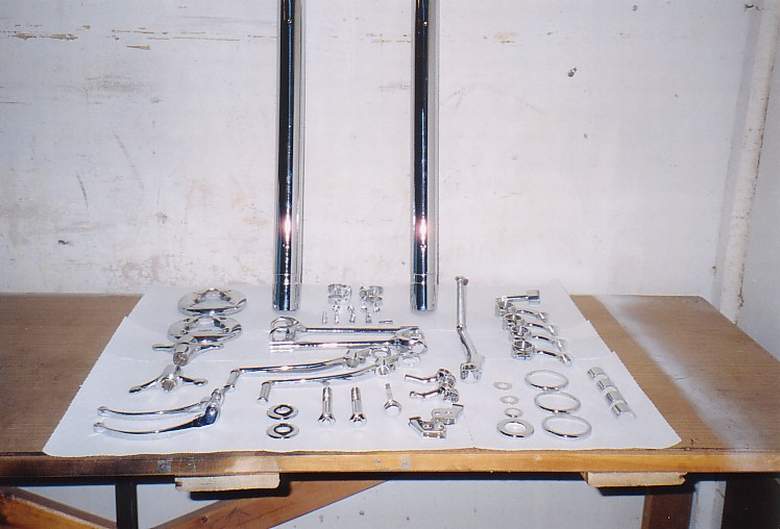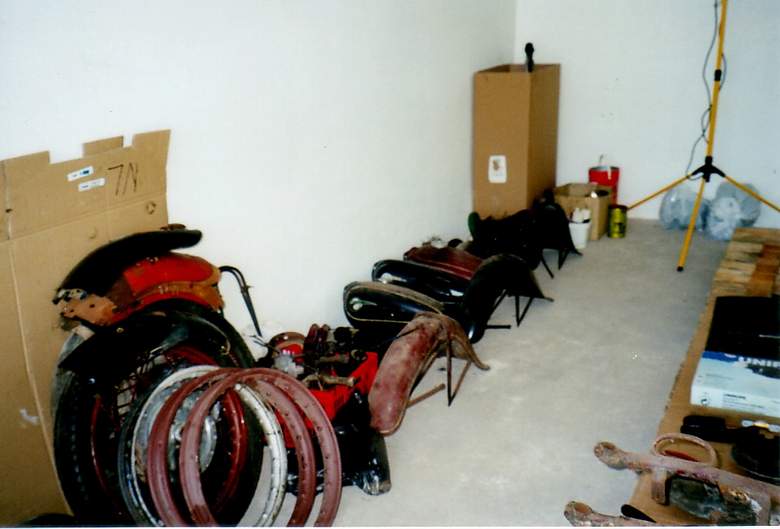 Elektrik: da von meinen vorhandenen drei Lichtmaschinen, schon rein nach optischer (!) Prüfung maximal nur noch eine für einen weiteren Einsatz in Betracht kam, entschloss ich mich, auf die Anlage von "MZ-B" umzurüsten. An originalen Kabelbäumen hatte ich eigentlich nichts mehr. Bei den beiden zerlegten Maschinen war nichts mehr da (logisch) und die "Kabelreste" von meiner Ausgangs-BK fielen schon beim Ansehen auseinander... Mit der neuen 12-Volt-Anlage gab es nun ein kleines Problem: woher die Becherbirnen in 12 Volt für die Kontrollampen nehmen? Aber auch da half das Internet, bzw. vorübergehend eine "Eigenkonstruktion" mit modernen Glassockellampen in speziell eingelöteten Fassungen. Bremsen: dank meines "Teilevorrates" konnte ich insgesamt auf zwei hintere und eine vordere Radnabe zurückgreifen, die nicht (!) gerissen, und dann mit der gängigen Schrauben- oder Nieten-Variante repariert waren. Die Bremstrommeln habe ich in einer Dreherei vom alten Meister persönlich ausdrehen lassen. Der gute Mann (bestimmt fast 70 Jahre alt) war zwar über das Bremsringmaterial nicht allzu erfreut, aber als er erfuhr, für welches Motorrad ich die Naben brauche, war ein leichtes Lächeln bei ihm nicht ganz zu übersehen. Das Honorar für seine Arbeit bewegte sich dann schon fast im "Kaffeekassenbereich", obwohl er sich für jede Nabe fast 45 Minuten Zeit ließ. Wie oft er dabei den Micrometertaster angesetzt hat (Rundlauf!) habe ich irgendwann aufgehört zu zählen. Etwas "mufflig", war er trotzdem echt ein Meister seines Faches. Prima Arbeit! Kolben/Zylinder: da alle vorhandenen Kolben/Zylinder ihre Laufleistung durch mehr oder weniger tiefe Riefen nicht verbergen konnten, fast alle sogar die eindeutigen Spuren von Kolbenklemmern bis hin zu "Verschweißungserscheinungen" im Bereich der Kolbenringe aufwiesen, war ein Neuschliff der Zylinder + neue Kolben logisch. Der Anbieter für Zylinderschleifen gibt es viele.... Auf der Suche nach einer geeigneten Firma, bin ich dann auf eine bestimmte Zylinderschleiferei nahe Leipzig verwiesen worden. Der dortige Inhaber restauriert und fährt selber jede Menge Oldtimer, gerade auch im "zweirädrigen Bereich"! Was will man mehr?! Das Aufsuchen dieser Werkstatt endete dann auch in einem fast zweistündigen "Fachsimpeln" über alles, was älter ist und sich selber noch auf zwei oder drei Rädern bewegt. Natürlich kam dann auch eine Einschätzung aus Profi-Sicht herüber, was die Qualität von Nachbaukolben von Fischer, oder Mali, oder anderen Anbietern betrifft. Das Gespräch war hochinteressant. Ganz "nebenbei" hat mir diese Werkstatt auch die Kühlrippenreparatur an den Zylinderköpfen hervorragend gemacht. Chromteile: hier habe ich relativ lange nach einem guten Galvaniseur suchen müssen. Da die Preise, gerade in dieser Branche, nicht gerade als "moderat" zu bezeichnen sind, galt es vieles zu beachten. In´s nachbarschaftliche Ausland wollte ich nicht ausweichen. Bei diversen Besuchen in einschlägigen Werkstätten konnte ich von Arroganz, über Toleranz, über Desinteresse bis hin zu offensichtlicher Unwilligkeit alles miterleben. Mein persönlicher Favorit und Insider-Tip wurde dann auch zum Auftragnehmer. Im höheren Preissegment angesiedelt, einer Wartezeit von ca. 12 Wochen, hatte diese Firma Erfahrungen mit Oldtimerteilen und einen sehr guten Ruf in der entsprechenden "Szene". Nach "schon" 10 Wochen hatte ich dann Anfang April 2002 meine Teile zurück. Super Qualität, allerdings mit Preisen, die schon in Richtung "Super Plus" gingen....